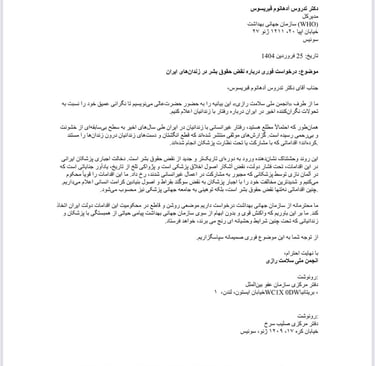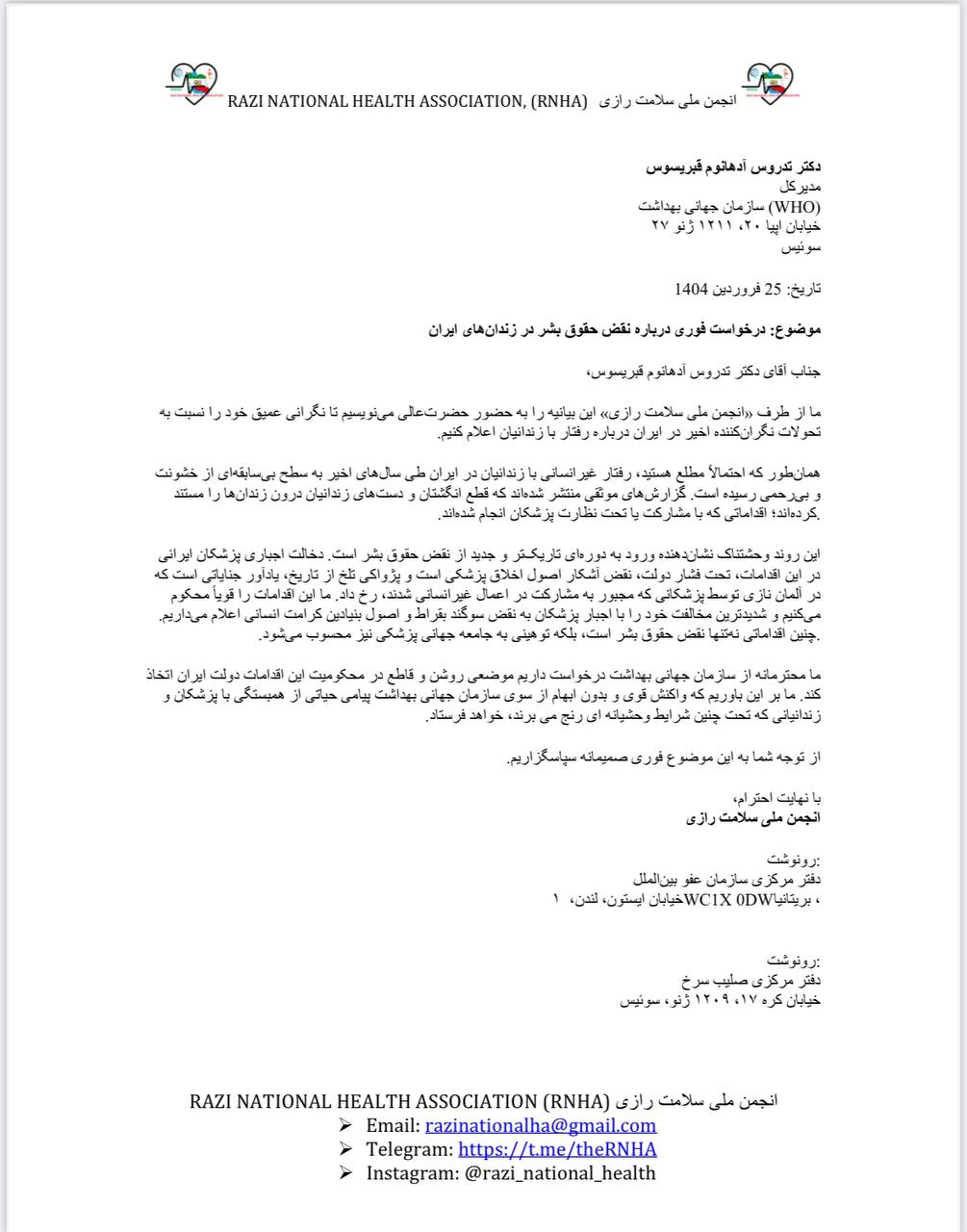 انجمن ملی سلامت رازی در نامهای به سازمان جهانی بهداشت، نسبت به نقض گسترده حقوق بشر و شرایط غیربهداشتی زندانهای ایران هشدار داده و خواستار بررسی فوری و اقدام جدی این نهاد بینالمللی شد. این انجمن تأکید کرده است که محرومیت زندانیان از خدمات درمانی و رفتارهای غیرانسانی، سلامت عمومی جامعه را نیز به خطر میاندازد.
