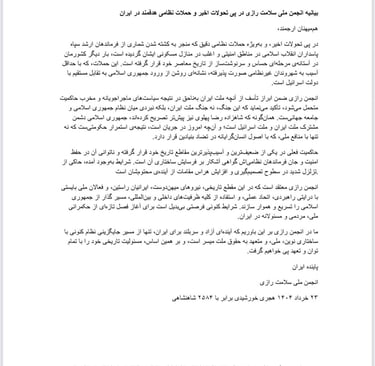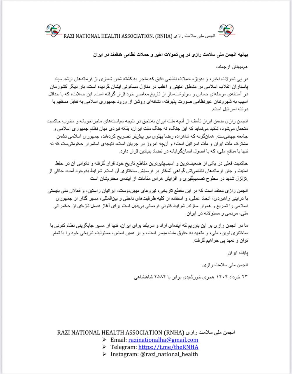 انجمن رازی ضمن ابراز تأسف از آنچه ملت ایران بهناحق در نتیجه سیاستهای ماجراجویانه و مخرب حاکمیت متحمل میشود، تأکید مینماید که این جنگ، نه جنگ ملت ایران، بلکه نبردی میان نظام جمهوری اسلامی و جامعه جهانیست. همانگونه که شاهزاده رضا پهلوی نیز پیشتر تصریح کردهاند، جمهوری اسلامی دشمن مشترک ملت ایران و ملت اسرائیل است؛ و آنچه امروز در جریان است، نتیجهی استمرار حکومتیست که نه تنها با منافع ملی، که با اصول انسانگرایانه در تضاد بنیادین قرار دارد.
